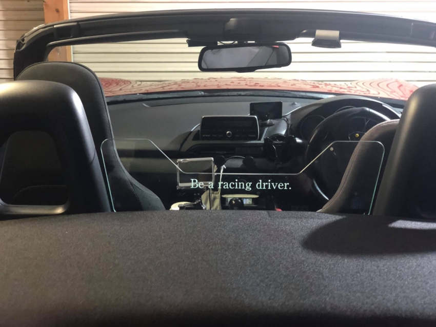 うれしいことに、ご依頼主さまはこのカッティングステッカーについてフェイスブックでご紹介くださいました。そこでも書かれているんですが、今回オーダーをいただいたのは反転文字。ガラスのように透明な素材の場合、正面に貼ると反射で2重に見えてしまうということで、ボードの運転席側(つまり裏側)から貼ろうと思い付かれたそう。ご依頼主さまこだわりの裏貼りです。そのため、「Be a racing driver.」の文字がスッキリ、クリアに見えています。