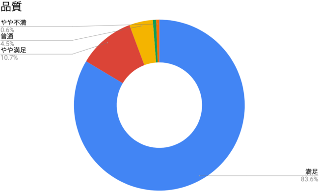 クワックワークスで制作したカッティングシートの品質に対する評価では「満足」(83.6%)、「やや満足」(10.7%)となっており、品質に満足したという評価が全体の94%となりました。前述の「うまく貼れた」という回答が9割近くとなっていたことと併せ、利用者の満足度は高いようです。
