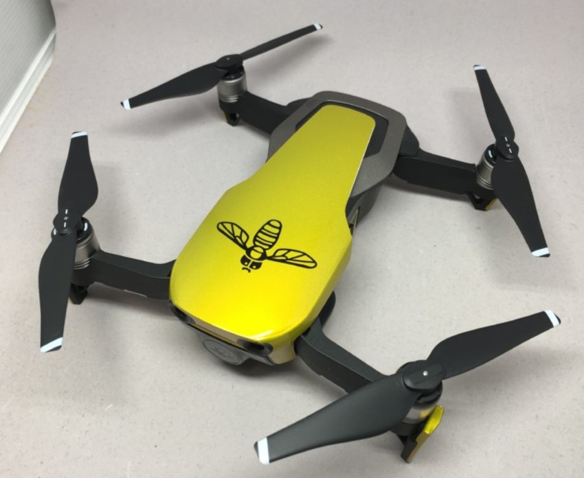 今回製作させていただいた切り文字シールは、(最初は蜂?かと思ったのですが)ハナアブをかたどったデザイン。けっこう細かく複雑な部分もありますが、きれいに仕上がりました。切り文字シールは文字通り、カッティングマシンという機械でフィルムを切り抜いて作りますが、当社のマシンは微細な加工が可能です。また、程よくストレッチ性のあるフィルムを使用しているので、このドローンの本体のような若干の曲面にもフィットして、きれいに貼ることができます。