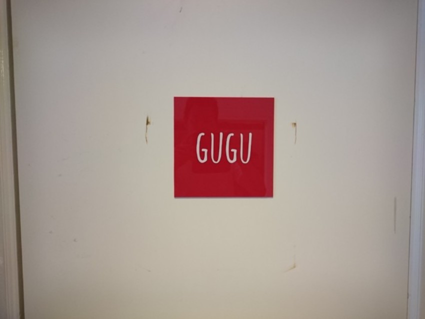このロゴは店名でしょうね。個性的な書体を白い切り文字シールで作ったものを赤いプレートに貼っていただきました。