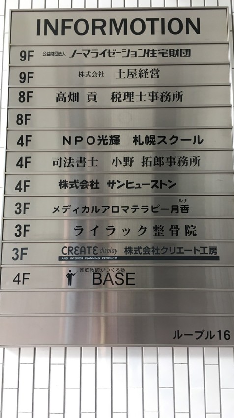 黒一色なので複数の企業が入っているオフィスビルのインフォメーションの看板の中で埋もれてしまいそうで心配でしたが、特徴的で解り易くて、どこに学習塾があるのか発見しやすいですね。