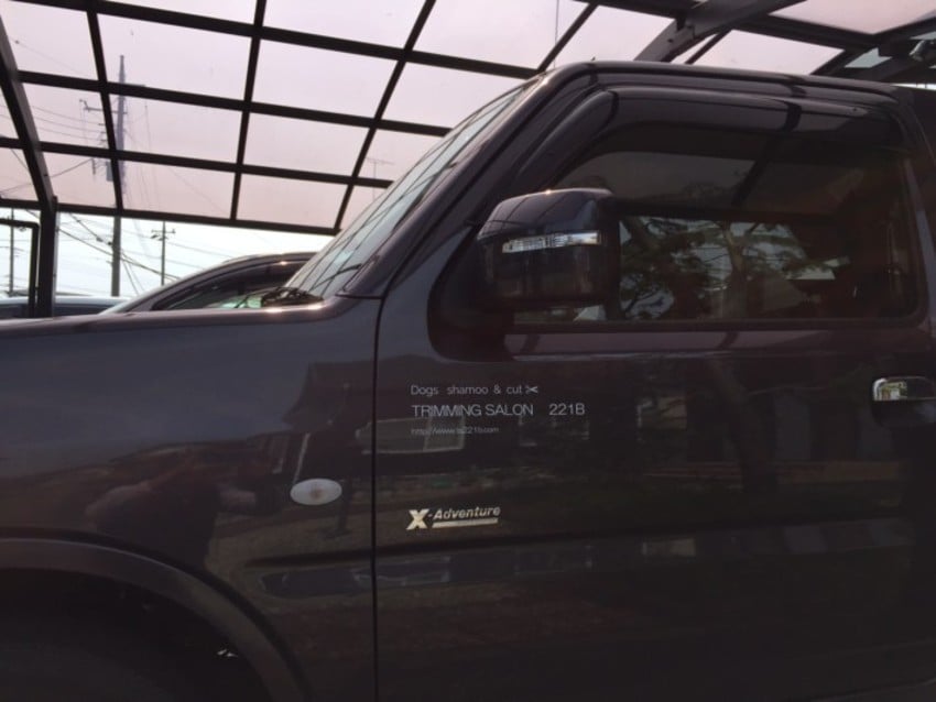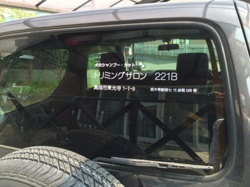 ワンちゃんのトリミングサロンをされているそうです。お店の名前やURLのカッティングステッカーを貼られたのは、営業車…ではなくて、自家用車なのですね。でも、これって、お店の宣伝になりますよね。走る広告塔です。