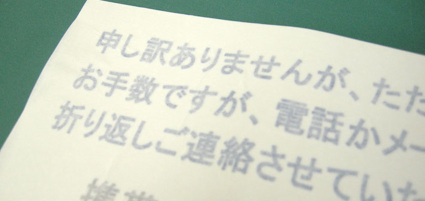 今回のご依頼は、カラフルな複数色の社名と案内と、反転した文字のものと、大きな文字の社名、不在時の案内、という4種類のデザインのご依頼を頂きました。反転した文字は、ガラスの内側から貼ると、外側から見た時に美しい仕上がりに見えます。裏側から見ても、シートの裏表は同じ色ですので、ストレスを感じることもありません。またご覧のように小さく細かい文字でも、弊社の技術により美しく正確に仕上げることが可能です。お客様の要望にあった様々なご依頼に対応できますので、何方様もお気軽に御注文ください。