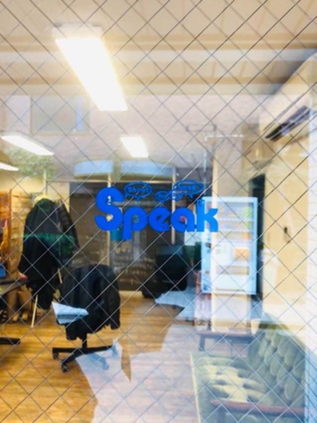 これは店舗の窓でしょうか。パッと目を引くブリリアントブルーに文字は「Speak」。“話す”という意味の英語ですね。文字の形も丸っこくてかわいいし、何より、それぞれの文字に顔がついているのがキュート! ニコニコ笑顔なので、みんなでワイワイおしゃべりをしているよう。このアイデア、すてきですね。見ているだけでも、なんだか楽しい気分になってきませんか。しかも、吹き出しが付いているので、さらに“おしゃべり感”がアップしていて楽しさ倍増です。さて、この吹き出しに書かれているのは、「Shoot」「for」「the」「peak」。つなげて読むと、「ピークを狙え!」というような意味になるのかしら。楽し気でかわいい雰囲気でありながら、さりげなくメッセージをプラスしているというワザあり!なものなんです。