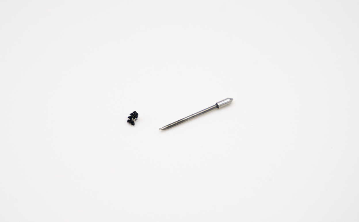 紹介したように小さすぎるデザインは毛羽立ってしまい、マシンで正常にカットすることができません。上記写真は先程の毛羽立ったデザインをカットした際にマシンのカッター部分に詰まったカッティングシートのカスです。右側に置いてあるのがカッター刃です。このとても小さいカッター刃の先端に、1度のカットでこれだけの黒いカス(写真左)がカット中に次々に付着してしまいました。