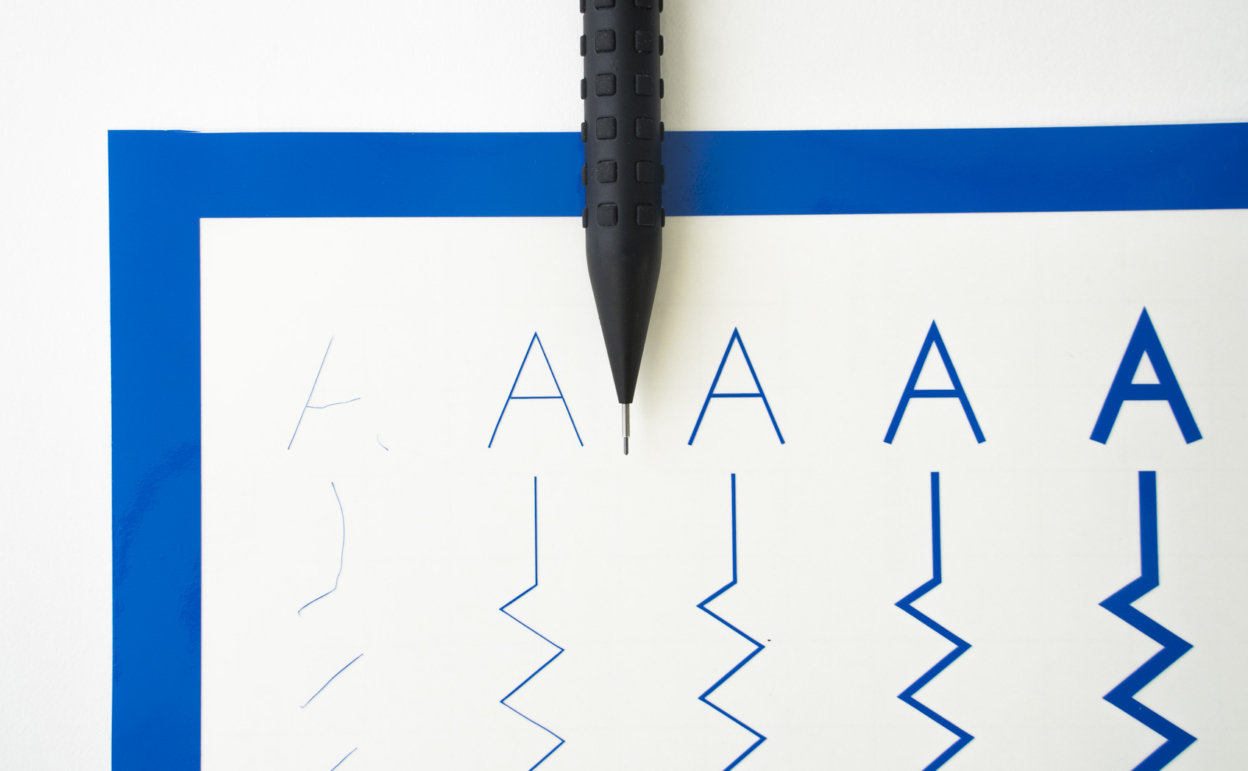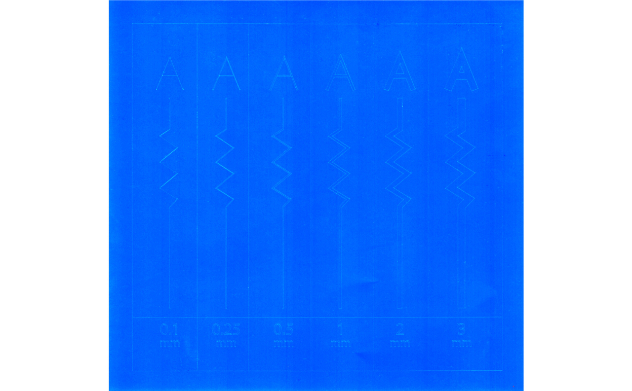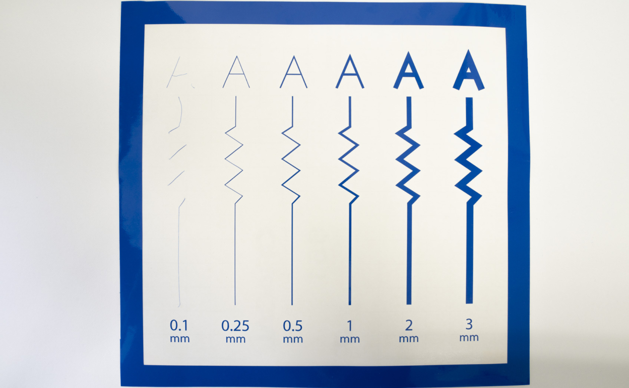 また写真は直線的で単純なデザインですが、0.25mmの直線のギザギザした部分はあまり均等な太さにはなっていません。これは機械でカットする際のブレによるもので、回避することは物理的に不可能です。曲線があるデザインであればこのブレは更に謙虚になります。様々なデザインで「カットの品質」「耐久性の品質」が保てないことから、0.5mmを最低ラインとして設けました。もしシャーペンをお持ちであれば、実際に芯の太さを確認して、これが粘着面になることをイメージしてみてください。0.5mm幅でも相当小さいことがご理解いただけると思います。