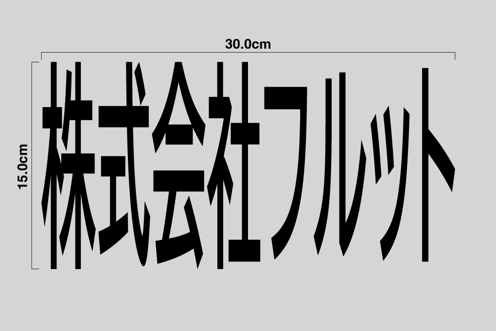 上記画像を例にすると、本来デザイン部分(株式会社フルット)のサイズは30.0 x 3.8cm(四捨五入)ですので、オーダーフォームでは基準となる辺の長さを指定いただく必要があります。ヨコ幅か長辺であれば30.0cm、タテ幅か短辺であれば3.8cmを指定すればOKです。しかしヨコ幅とタテ幅を同時に指定した場合はどうなるでしょうか。